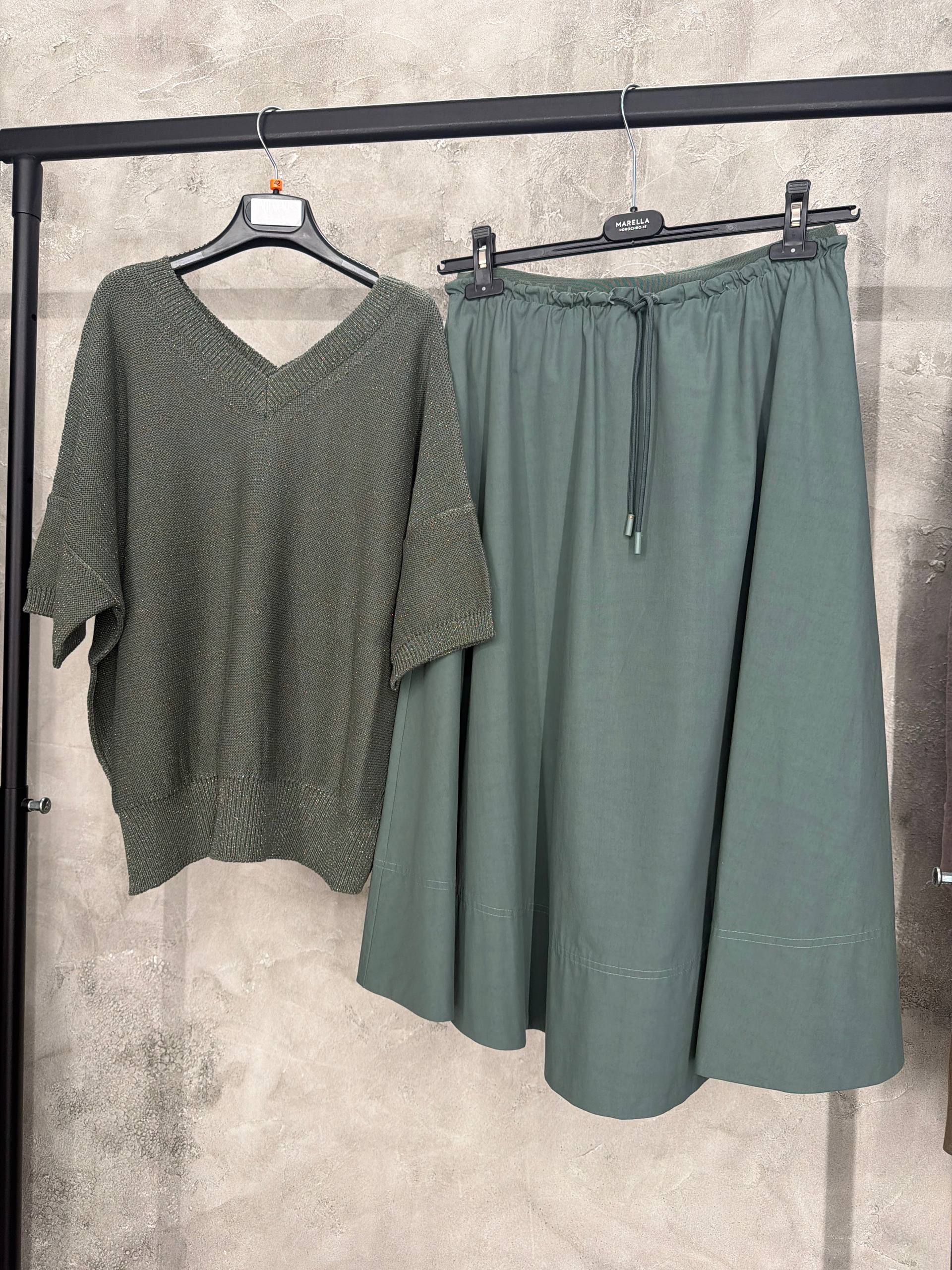 Стильный женский образ от бренда Marella. Комплект состоит из легкого трикотажного джемпера и юбки миди. Джемпер оливкового цвета с V-образным вырезом и короткими рукавами имеет свободный крой и деликатный блеск люрекса. Юбка серо-зеленого оттенка выполнена в фасоне А-силуэта с эластичным поясом на кулиске для регулировки посадки. Состав джемпера: 75% вискоза, 15% полиамид, 10% металлизированное волокно. Состав юбки: 100% хлопок.