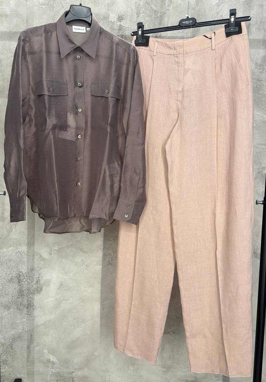 Элегантный женский комплект от бренда Marella. В набор входит полупрозрачная рубашка серо-коричневого оттенка и классические широкие брюки светло-бежевого цвета. Рубашка выполнена в свободном фасоне с отложным воротником, длинными рукавами и двумя накладными карманами на груди. Брюки с высокой посадкой дополнены защипами, стрелками и боковыми карманами. Состав: рубашка — 100% шелк, брюки — 100% лен. На воротнике и вешалках виден логотип Marella.