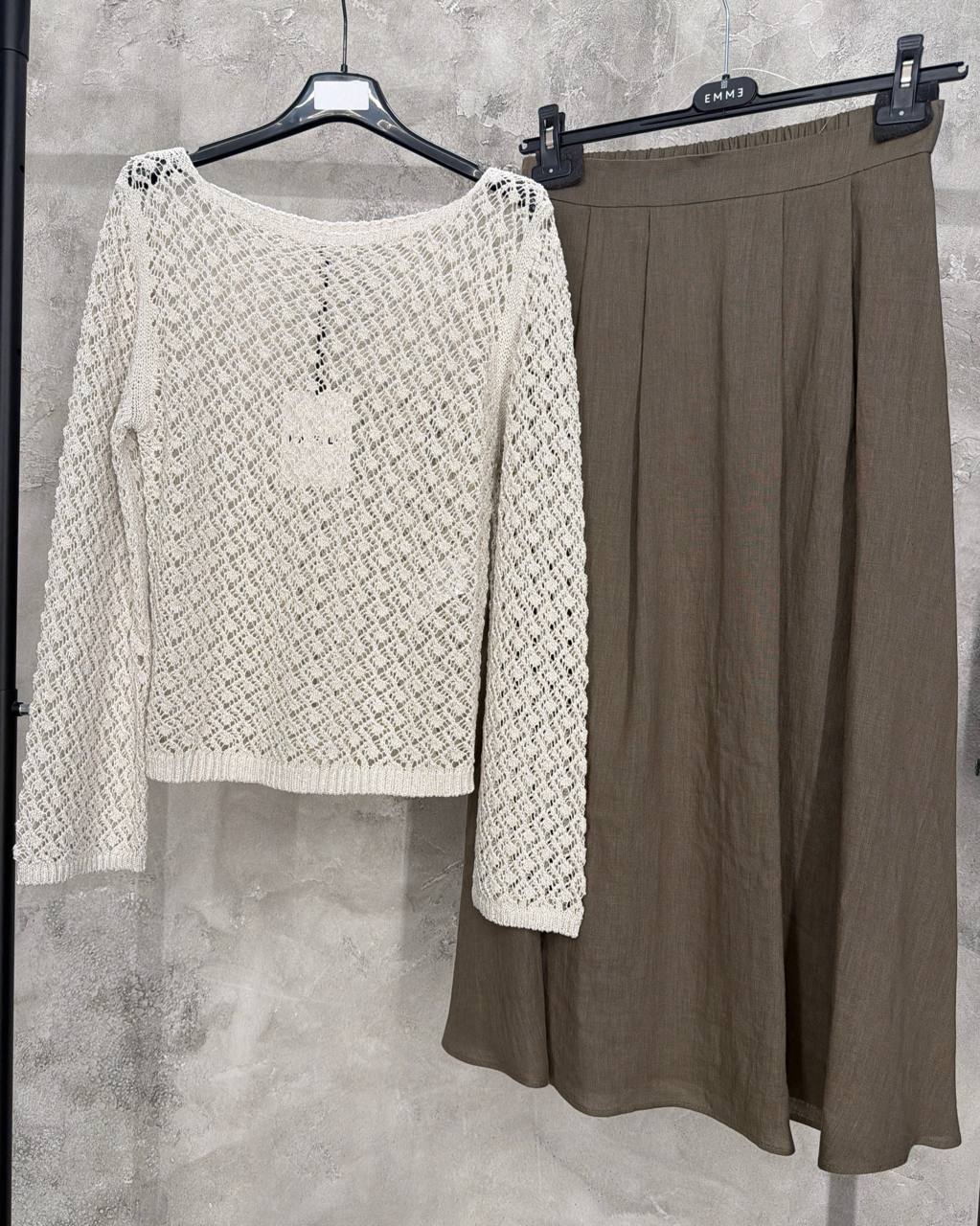 Стильный женский комплект, состоящий из ажурного джемпера и юбки макси. Джемпер молочного цвета выполнен из фактурного трикотажа с сетчатым узором в виде ромбов, имеет вырез лодочкой и слегка расширяющиеся книзу рукава. Юбка длины макси в благородном оливковом оттенке имеет свободный крой и мягкие складки у пояса, подчеркивающие талию. Состав: джемпер — 100% хлопок, юбка — 100% лен.