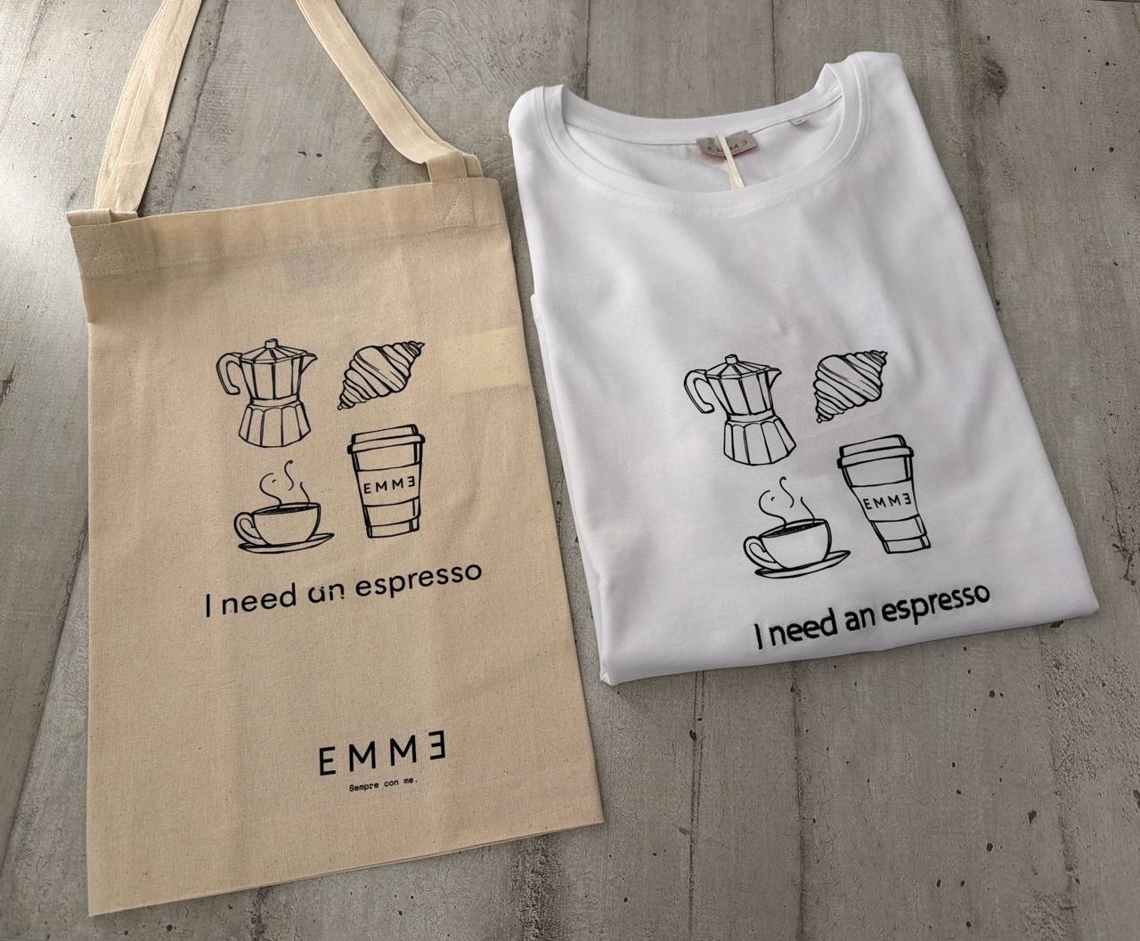 Стильный комплект, состоящий из хлопковой футболки белого цвета и текстильной сумки-шоппера в бежевом оттенке. Оба изделия декорированы минималистичным графичным принтом с изображением гейзерной кофеварки, круассана, чашки кофе и стакана с надписью «EMM3», а также фразой «I need an espresso». Футболка классического прямого кроя с круглым вырезом горловины. Шоппер дополнен логотипом бренда EMM3 и слоганом «Sempre con me». Состав: 100% хлопок.