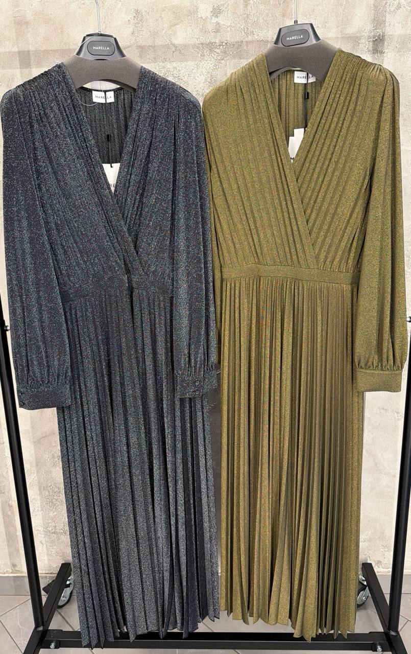 Элегантные плиссированные платья макси от бренда Marella. Модель приталенного кроя с V-образным вырезом на запах и длинными рукавами на манжетах. Ткань с деликатным мерцанием люрекса придает изделиям праздничный вид. Платья представлены в двух цветовых вариантах: темно-серый с разноцветным шиммером и оливково-золотистый. На вешалках и бирках присутствует логотип Marella. Состав: 100% полиэстер.
