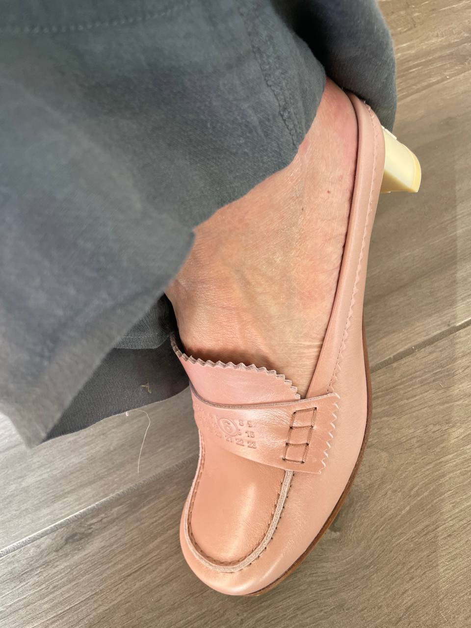 Элегантные женские мюли в стиле лоферов, выполненные из гладкой натуральной кожи нежно-розового цвета. Модель декорирована декоративной строчкой, зубчатым краем язычка и фирменным тисненым числовым логотипом Maison Margiela на передней части. Обувь имеет открытую пятку и дополнена устойчивым невысоким каблуком светлого оттенка. Состав: 100% натуральная кожа.