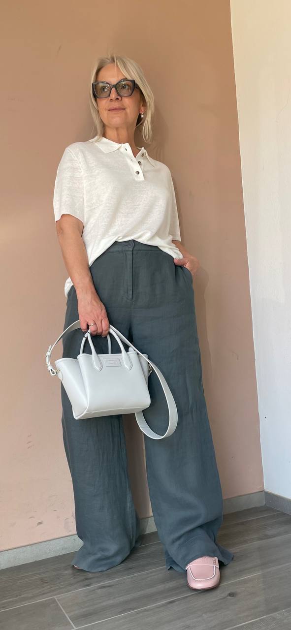Стильный женский образ в спокойных тонах. Комплект состоит из белого трикотажного поло с короткими рукавами и застежкой на пуговицы, а также широких брюк-палаццо графитового оттенка с высокой посадкой. Наряд дополнен аксессуарами: светло-серой сумкой с короткими ручками и небольшим логотипом, розовыми кожаными лоферами и солнцезащитными очками в темной оправе. Состав: поло — 100% лен, брюки — 100% лен, обувь и сумка — 100% натуральная кожа.