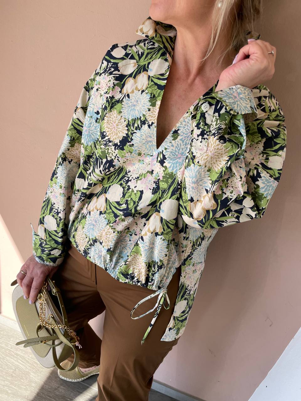 Стильная женская блуза с ярким флористическим принтом в зеленых, бежевых и голубых оттенках. Модель прямого свободного кроя с глубоким V-образным вырезом и классическим отложным воротником. Длинные рукава оформлены манжетами на пуговицах. Особенностью модели является регулируемая кулиска с завязками по бокам снизу. Состав: 100% вискоза.