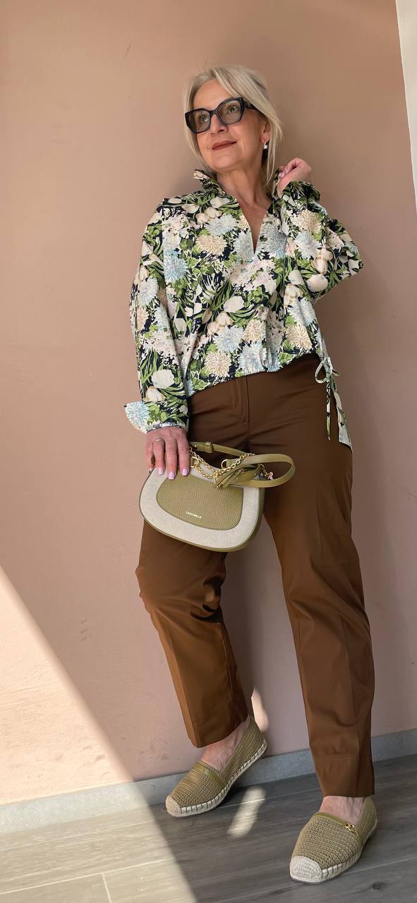Элегантный женский образ, состоящий из легкой блузы с ярким цветочным принтом и классических коричневых брюк. Блуза свободного фасона с воротником-стойкой, V-образным вырезом и длинными рукавами украшена флористическим паттерном в зеленых, персиковых и темно-синих тонах. Брюки прямого кроя со стрелками выполнены в глубоком коричневом цвете. Образ дополнен сумкой Coccinelle из комбинированных материалов (зеленая кожа и светлый текстиль) с золотистой фурнитурой, а также бежевыми плете