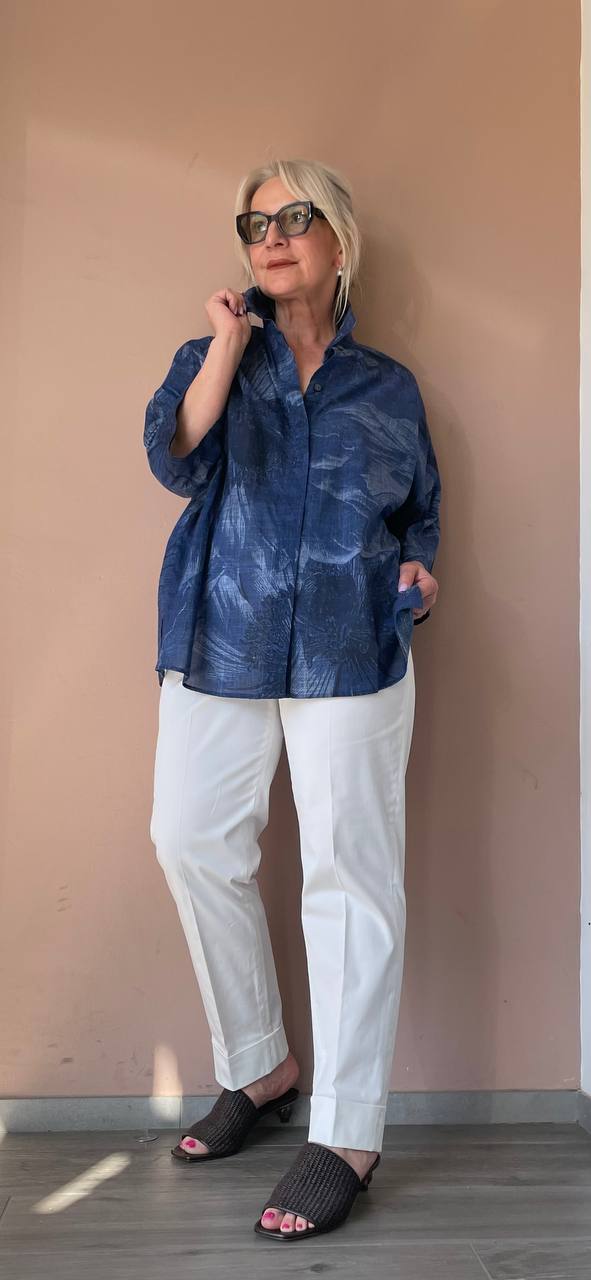 Элегантный женский образ, состоящий из свободной рубашки и классических брюк. Рубашка выполнена в темно-синем цвете с крупным абстрактным цветочным принтом, имеет фасон оверсайз, отложной воротник и длинные рукава. Белые брюки прямого кроя дополнены четкими стрелками и широкими подворотами по низу. Образ дополнен аксессуарами: массивными очками в черной оправе и плетеными сабо. Видимые логотипы отсутствуют. Состав: рубашка — 100% лен, брюки — 95% хлопок, 5% эластан.
