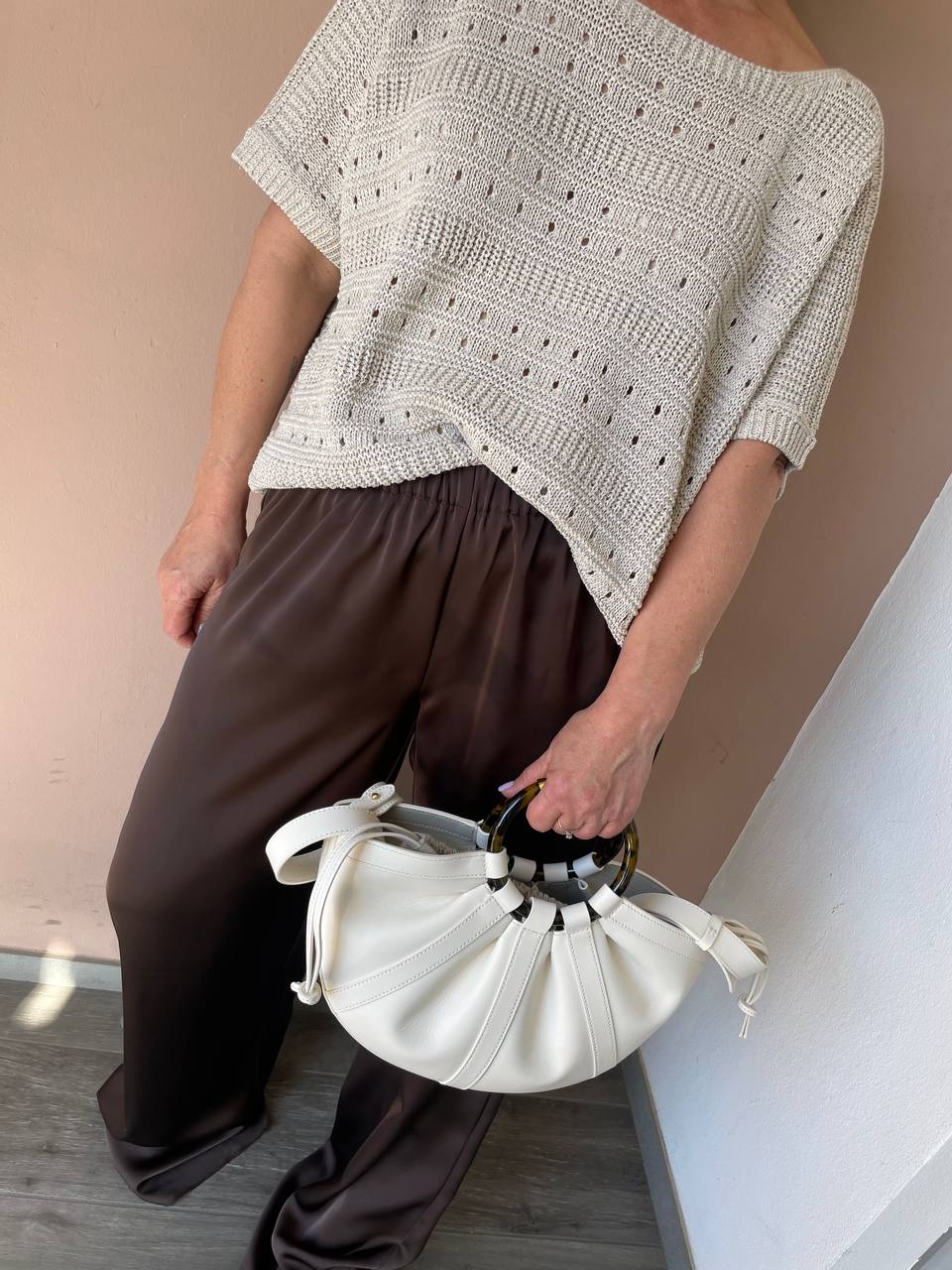 Элегантный женский образ в спокойных тонах. В комплект входит бежевый джемпер свободного кроя с короткими рукавами, выполненный ажурной вязкой. Состав: хлопок и лен. Низ представлен широкими брюками шоколадного цвета с атласным блеском на эластичном поясе. Состав: вискоза и полиэстер. Образ дополнен молочной сумкой из мягкой кожи с плиссировкой и декоративными круглыми ручками с черепаховым принтом. Логотипы на изделиях отсутствуют.