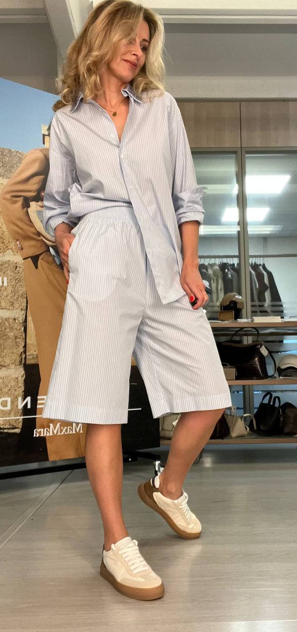 Стильный женский костюм-двойка в тонкую бело-голубую вертикальную полоску. Комплект свободного кроя состоит из рубашки с длинным рукавом и широких шорт-бермуд. Рубашка застегивается на пуговицы и дополнена классическим отложным воротником с декоративной отделкой мелкими стразами. Шорты имеют комфортную посадку на эластичном поясе и боковые карманы. Лаконичный дизайн в пижамном стиле идеально подходит для повседневных летних образов. Состав: 100% хлопок.