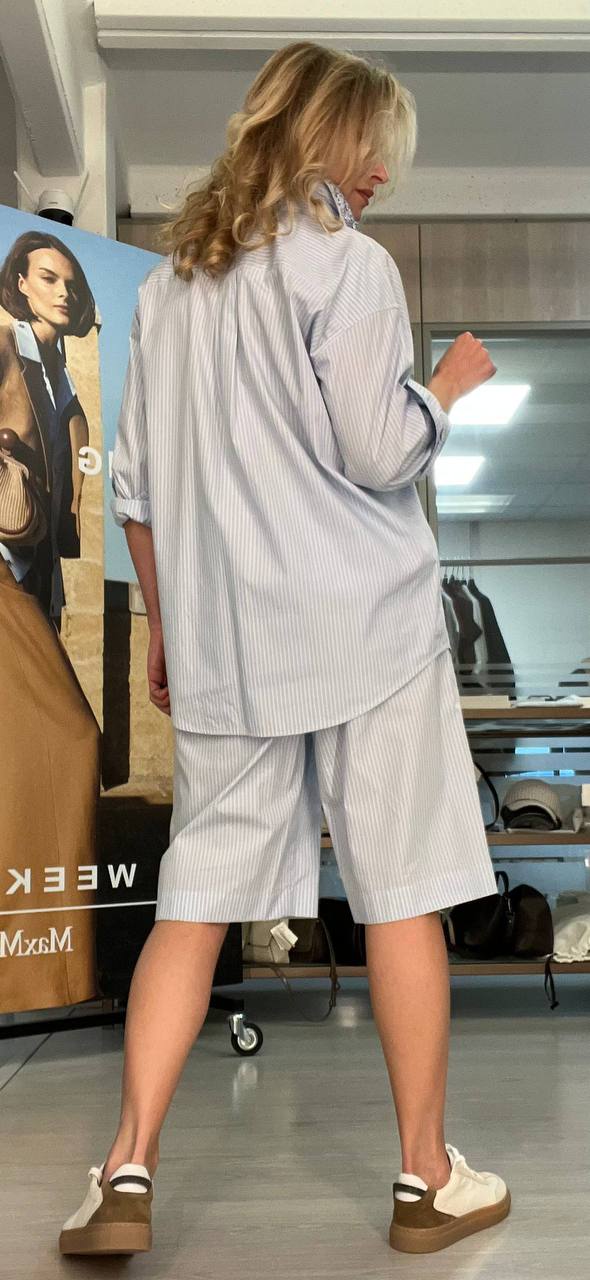 Стильный женский комплект в вертикальную бело-голубую полоску, состоящий из объемной рубашки свободного кроя и широких шорт средней длины. Рубашка имеет спущенную линию плеча и классический воротник, рукава дополнены манжетами. Шорты свободного фасона обеспечивают легкость и комфорт. Состав: 100% хлопок. Образ дополняют базовые белые кеды с контрастной коричневой деталью на пятке.