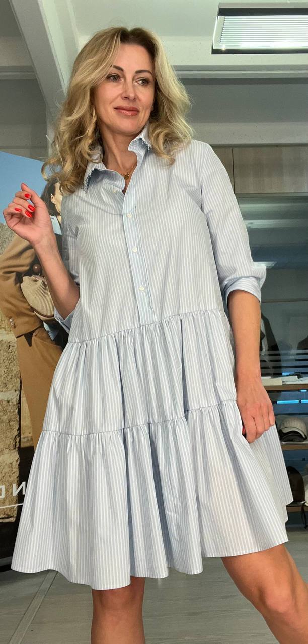 Элегантное женское платье-рубашка в голубую и белую вертикальную полоску. Модель свободного кроя с многоярусной юбкой, создающей легкий и воздушный силуэт. Изделие имеет классический отложной воротник с декоративной бахромой по краю и застежку на пуговицы по всей длине. Длинные рукава дополнены манжетами. Состав: 100% хлопок.