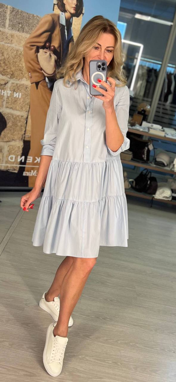 Элегантное женское платье-рубашка в мелкую бело-голубую вертикальную полоску. Модель имеет свободный фасон с многоярусной юбкой (воланами), классический отложной воротник и застежку на пуговицы по центру груди. Рукава длиной до локтя с аккуратными подворотами. Состав: 100% хлопок. Легкий и женственный образ для повседневного гардероба.