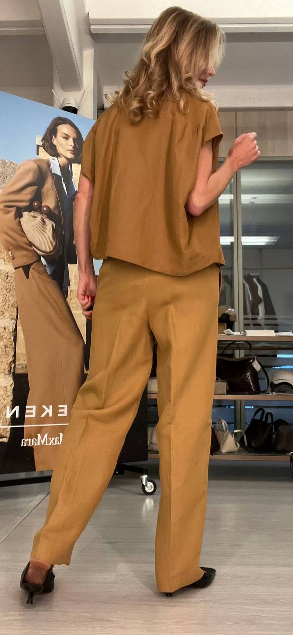 Элегантный женский костюм горчичного цвета, состоящий из свободного топа с короткими рукавами и прямых брюк со стрелками. Костюм выполнен в лаконичном стиле без видимых логотипов, обеспечивая идеальную посадку и современный силуэт. Брюки классического кроя подчеркивают линию ног, а легкий оверсайз топа добавляет образу расслабленности. Состав: 70% вискоза, 30% лен.