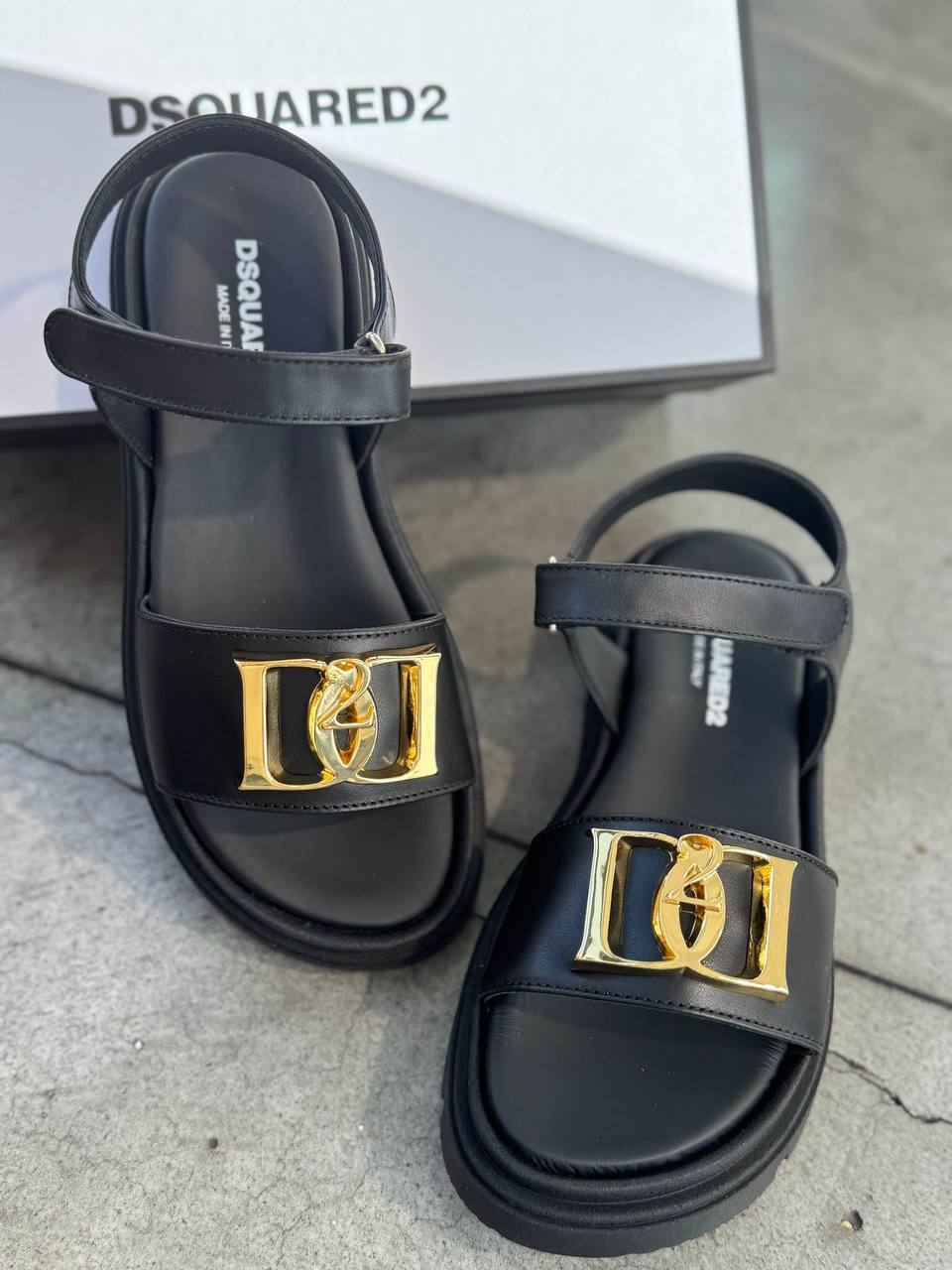 Элегантные женские сандалии Dsquared2 выполнены в глубоком черном цвете. Главным декоративным элементом является массивная золотистая фурнитура в виде логотипа бренда на переднем ремешке. Модель дополнена регулируемым ремешком на щиколотке для надежной фиксации стопы. Подошва плоская, массивная, с небольшим протектором. Предположительный состав: верх и стелька — натуральная кожа, подошва — износостойкий полимер. Отличный выбор для создания стильных летних образов.