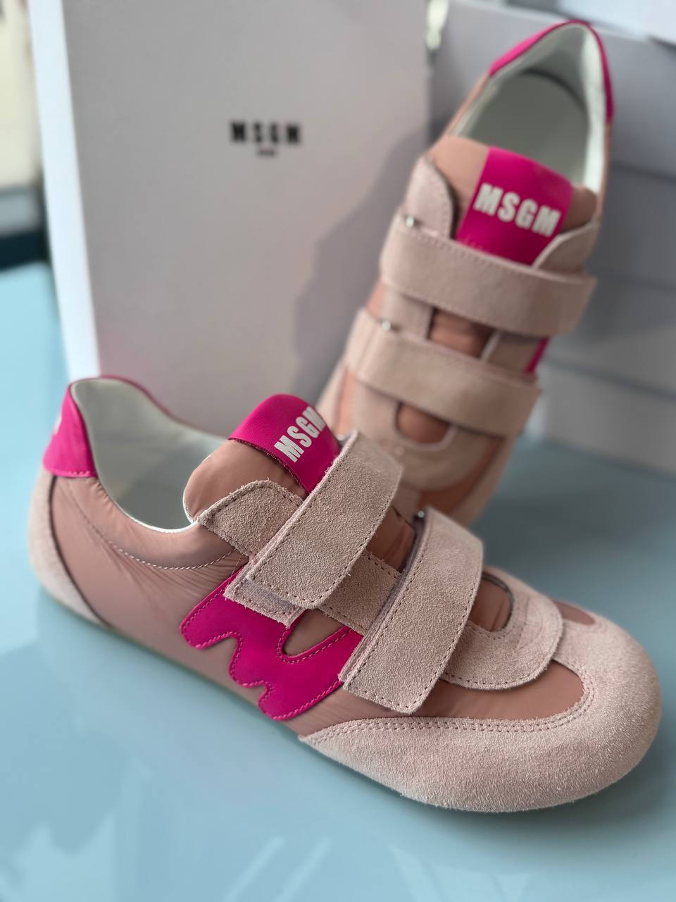 Женские кроссовки MSGM в спортивном стиле, выполненные в контрастной розовой гамме (пыльно-розовый и фуксия). Модель фиксируется тремя широкими ремешками на липучках. На язычке расположен белый логотип бренда MSGM на ярко-розовом фоне. Дизайн отличается округлым носком и многослойными вставками. Предположительный состав: верх выполнен из комбинации натуральной замши и прочного текстиля (нейлона), внутренняя отделка — кожа или мягкий текстиль, подошва — износостойкая резина.