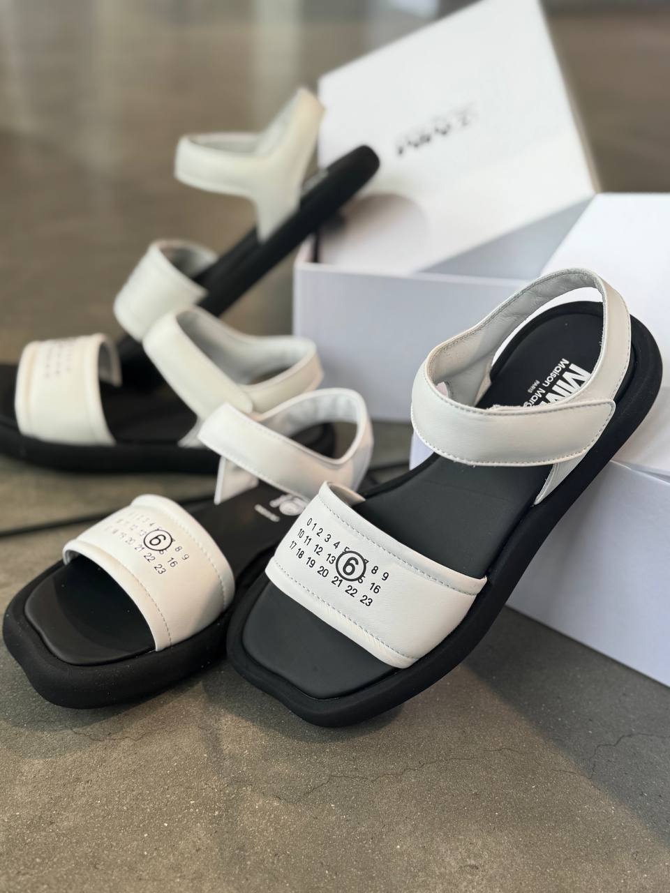 Женские сандалии в стиле MM6 Maison Margiela. Модель выполнена в контрастном черно-белом цвете с массивной черной подошвой и белыми ремешками. На широком переднем ремешке нанесен фирменный логотип в виде числовой сетки с выделенной цифрой 6. Обувь оснащена удобным регулируемым ремешком на пятке с застежкой-липучкой. Предположительный состав: верх — натуральная или экокожа, подошва — износостойкая резина или EVA.