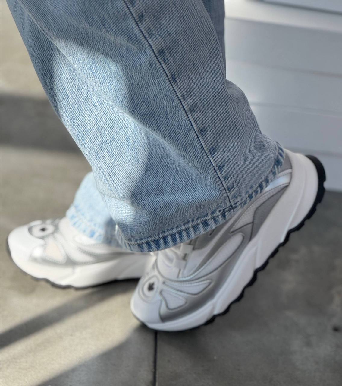 Стильные женские кроссовки в массивном стиле (chunky sneakers). Модель выполнена в комбинации белого цвета и серебристых металлизированных вставок. Верх обуви дополнен сетчатыми текстильными деталями для лучшей вентиляции. Кроссовки имеют толстую подошву белого цвета с черным рельефным протектором. На язычке и мыске расположен круглый декоративный логотип. Обувь отлично сочетается с широкими голубыми джинсами. Предположительный состав: искусственная кожа, текстиль, резина.