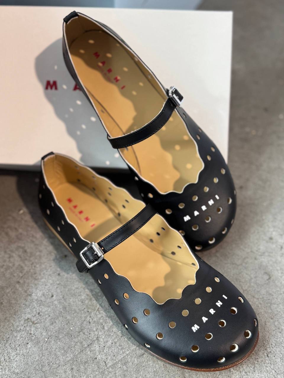 Элегантные женские балетки Marni в стиле Мэри Джейн, выполненные в черном цвете. Модель отличается декоративной перфорацией по всей поверхности и характерным волнообразным (фестончатым) краем. Обувь дополнена тонким ремешком с металлической пряжкой для регулировки полноты. Логотип бренда нанесен на стельку и внешнюю сторону мыска. Предположительный состав: 100% натуральная кожа.