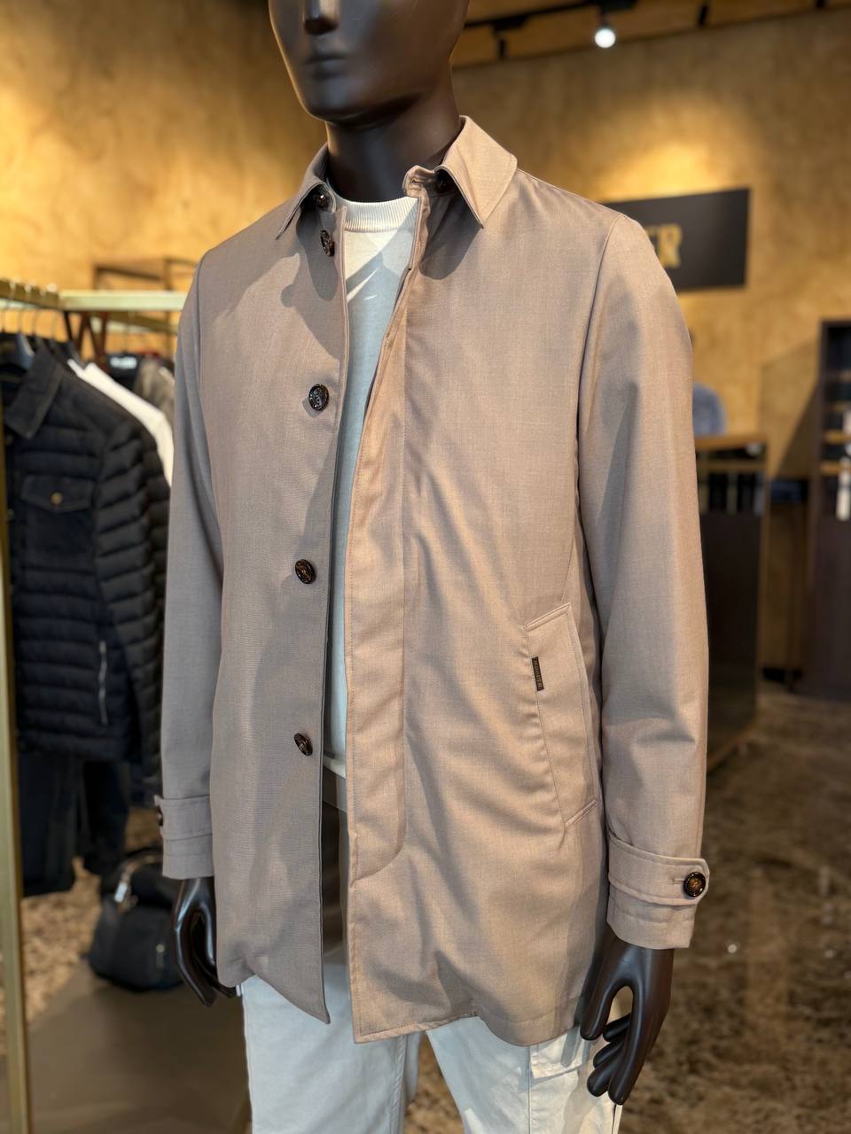 Мужская легкая куртка-плащ бежевого цвета. Модель прямого кроя с классическим отложным воротником и центральной застежкой на пуговицы. На рукавах предусмотрены паты (ремешки) на пуговицах. Изделие дополнено прорезными боковыми карманами, на одном из которых расположена небольшая фирменная нашивка с логотипом. Ткань плотная, предположительный состав: хлопок с добавлением полиэстера для защиты от ветра.