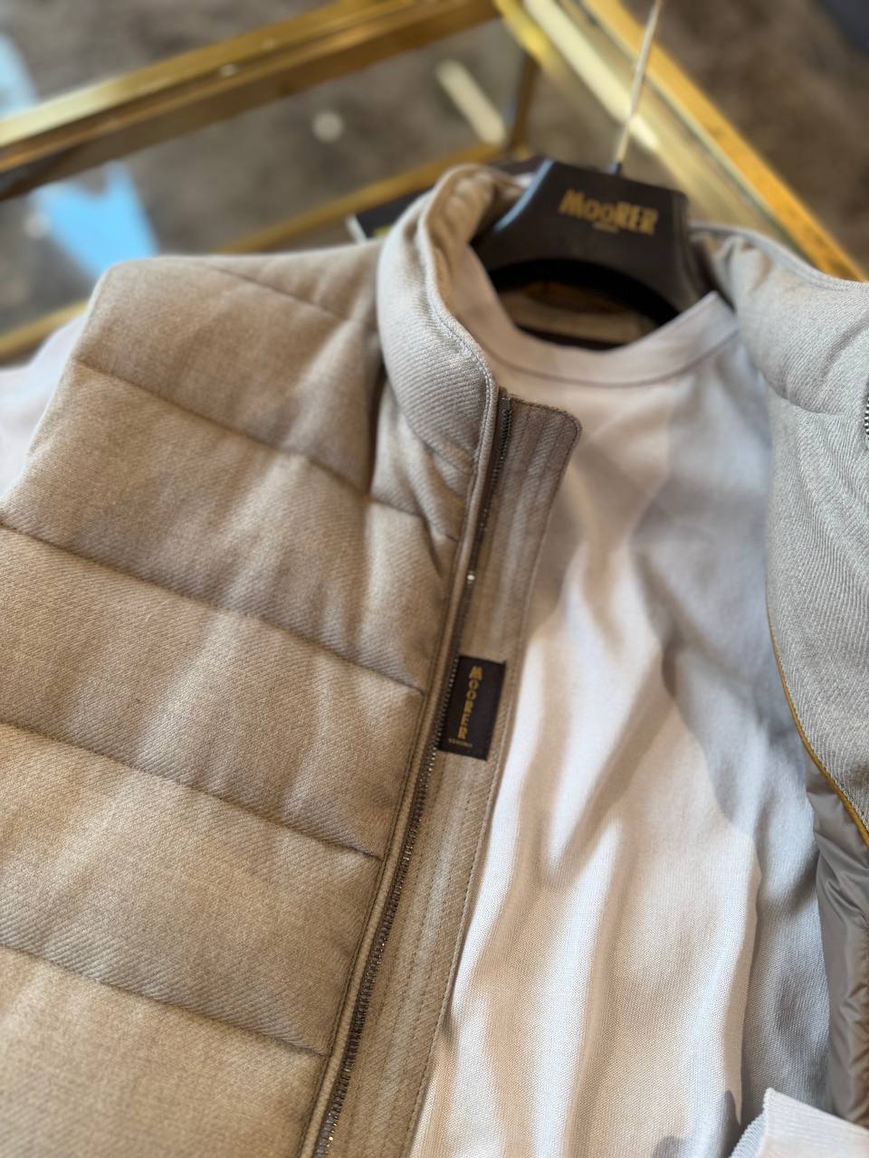 Мужской стеганый жилет итальянского бренда Moorer в элегантном светло-бежевом оттенке. Модель классического кроя с горизонтальной стежкой, воротником-стойкой и надежной застежкой на молнию. Ткань верха имеет мягкую фактуру с меланжевым эффектом, что характерно для высококачественных смесовых составов из шерсти и кашемира. Изделие дополнено фирменной нашивкой и брендированной фурнитурой. Наполнитель — натуральный гусиный пух, обеспечивающий отличную терморегуляцию.