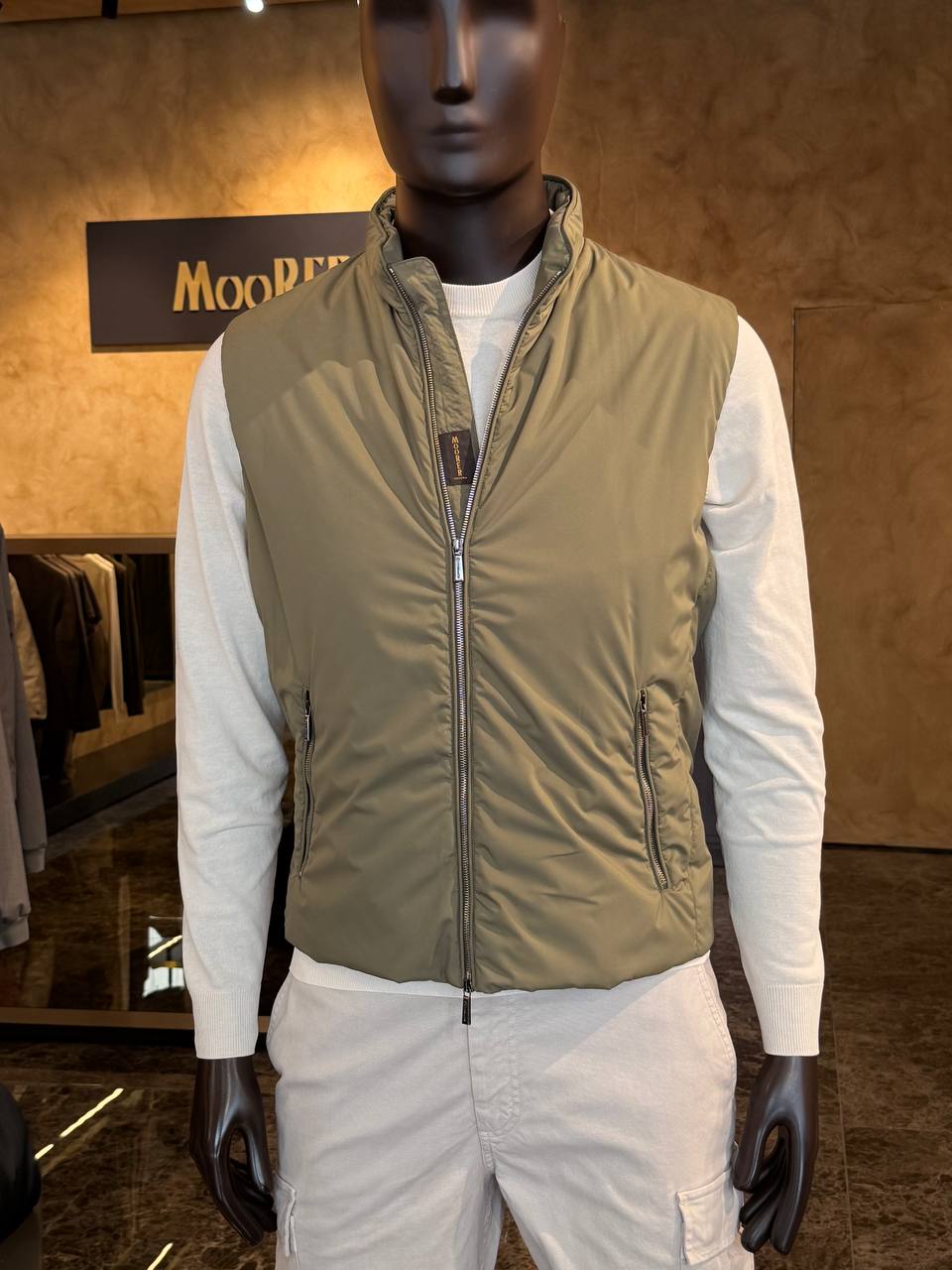 Мужской стеганый жилет бренда Moorer в оливковом цвете (хаки). Модель прямого фасона с воротником-стойкой, центральной застежкой на молнию и двумя боковыми прорезными карманами на молнии. На внутренней планке воротника расположен фирменный логотип. Предположительный состав: верх и подкладка из высококачественного полиамида, утеплитель из натурального гусиного пуха и пера. Жилет представлен в комбинации со светлым джемпером и брюками-карго, создавая современный повседневный образ.