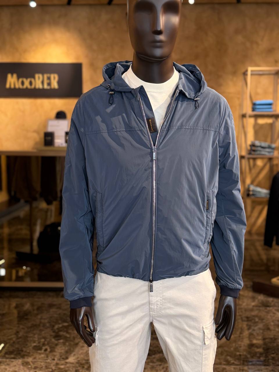 Мужская легкая куртка-ветровка от премиального бренда Moorer в приглушенном серо-голубом цвете. Модель прямого кроя оснащена несъемным капюшоном на кулисках, центральной застежкой-молнией и боковыми карманами. Рукава и нижний край дополнены эластичными трикотажными манжетами для защиты от ветра. На груди и фурнитуре присутствует лаконичный брендинг. Предположительный состав: 100% полиамид (высокотехнологичная ткань с легким блеском).