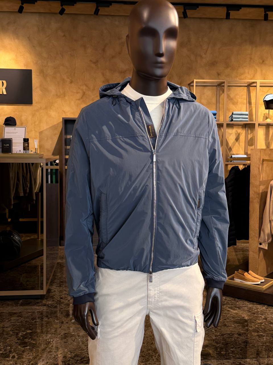 Мужская легкая куртка-ветровка серо-синего цвета от бренда Moorer. Модель прямого кроя с капюшоном на регулируемой кулиске и центральной застежкой-молнией. Куртка оснащена двумя боковыми прорезными карманами на молнии. Эластичные трикотажные манжеты и нижний край изделия обеспечивают комфортную посадку и защиту от ветра. Ткань имеет характерный для технологичного нейлона матовый блеск. Дизайн дополнен неброским логотипом бренда на кармане. Предположительный состав: 100% полиамид.