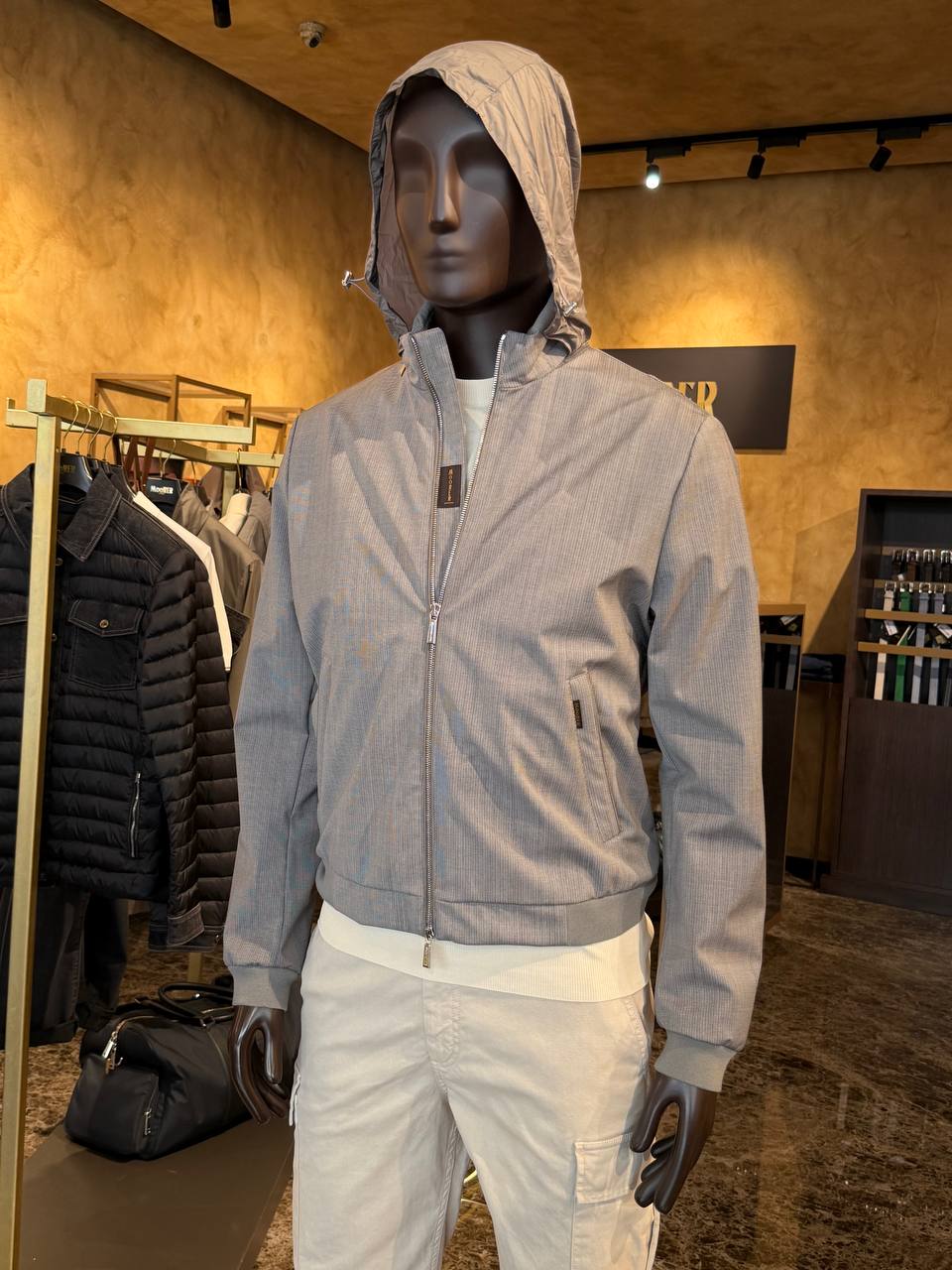 Мужская легкая куртка (ветровка) серо-бежевого цвета с капюшоном. Модель выполнена из высококачественной ткани с едва заметным текстурным микро-узором. Куртка имеет прямой крой, застегивается на центральную двухстороннюю металлическую молнию. Дизайн дополнен боковыми карманами на молнии и эластичными манжетами на рукавах и по низу изделия. На груди и боковом кармане присутствуют небольшие брендированные нашивки Moorer. Тонкий капюшон регулируется с помощью кулисок. Предполагаемый сос