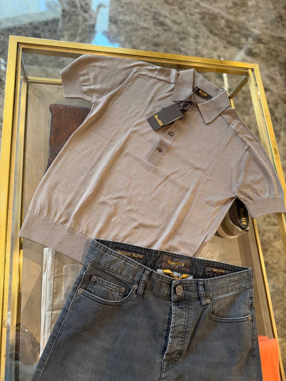 Элегантный мужской образ от люксового бренда Moorer. Комплект включает в себя трикотажное поло благородного серо-коричневого оттенка (тауп) с коротким рукавом, отложным воротником и планкой на трех пуговицах. Поло дополнено темно-серыми джинсами прямого кроя, выполненными из высококачественного японского денима (Japanese Fabric), о чем свидетельствует внутренняя нашивка. На одежде присутствуют фирменные бирки и логотипы Moorer. Предполагаемый состав: поло — мерсеризованный хлопок или смесь шелка и хлопка; джинсы — хлопок с добавлением эластана.