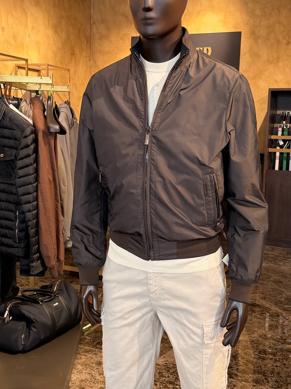 Элегантная мужская куртка-бомбер глубокого коричневого цвета. Модель выполнена в классическом стиле с воротником-стойкой, трикотажными манжетами и эластичным поясом в рубчик. Куртка оснащена центральной застежкой-молнией и двумя вертикальными боковыми карманами на молнии. Минималистичный дизайн дополнен качественной брендированной фурнитурой. Предположительный состав: верх — 100% полиамид или полиэстер с легким благородным блеском, трикотажные элементы — смесь хлопка и эластана.
