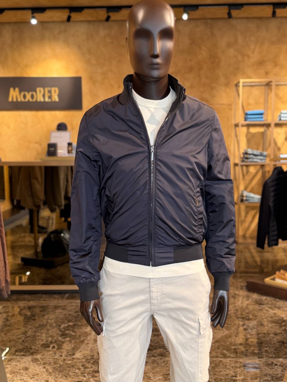 Мужской темно-синий бомбер от итальянского бренда Moorer. Модель классического кроя с воротником-стойкой и центральной застежкой на металлическую молнию. Рукава и нижний край дополнены плотными эластичными трикотажными манжетами для защиты от ветра. Изделие выполнено из гладкого высокотехнологичного нейлона с легким матовым блеском. По бокам расположены аккуратные прорезные карманы. Лаконичный и функциональный элемент мужского гардероба. Предположительный состав: 100% полиамид.