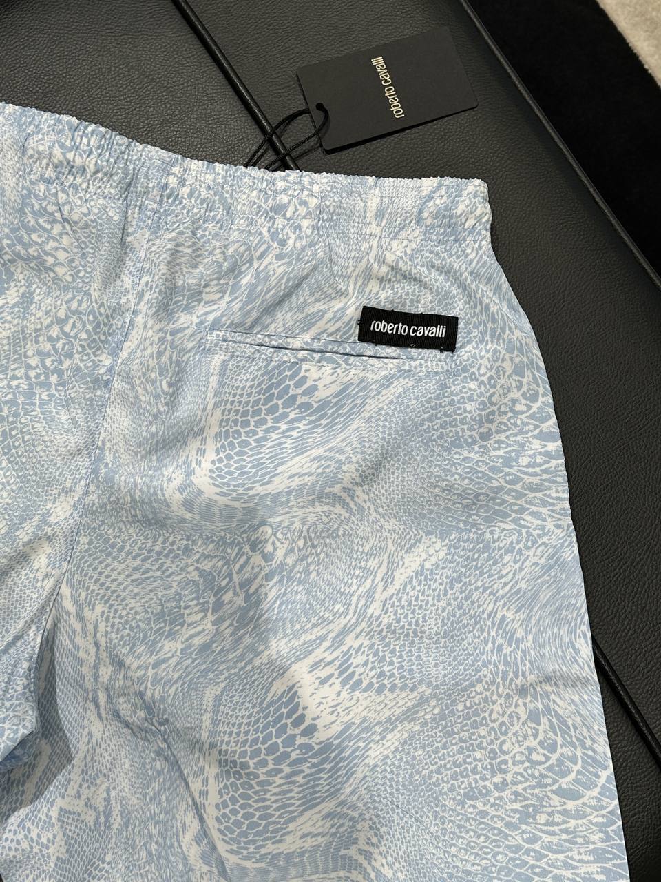 Мужские шорты Roberto Cavalli с характерным для бренда анималистичным принтом под змеиную кожу в бело-голубой цветовой гамме. Модель свободного кроя на эластичном поясе, дополнена задним прорезным карманом с черной нашивкой-логотипом. Материал легкий и гладкий, предположительно полиэстер или полиамид, что подходит для использования в качестве плавок или летней одежды.