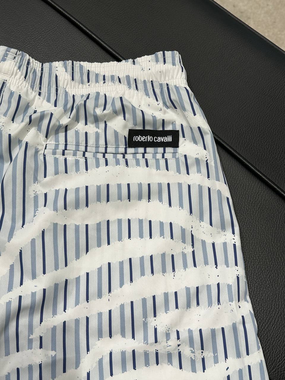 Мужские плавательные шорты Roberto Cavalli с оригинальным графическим принтом. Модель выполнена в бело-голубой цветовой гамме и сочетает в себе вертикальные полосы с волнообразными узорами. На заднем прорезном кармане расположена черная текстильная нашивка с контрастным логотипом бренда. Шорты имеют эластичный пояс для комфортной посадки. Материал легкий и быстросохнущий, предположительный состав — 100% полиэстер или полиамид.